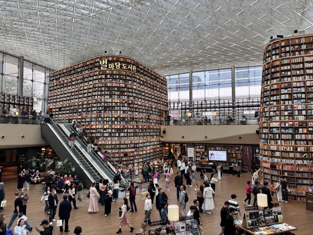 最後はピョルマダン図書館へ。大型ショッピングモール内にある有名な図書館で、高い本棚と開放感のある空間が印象的でした。