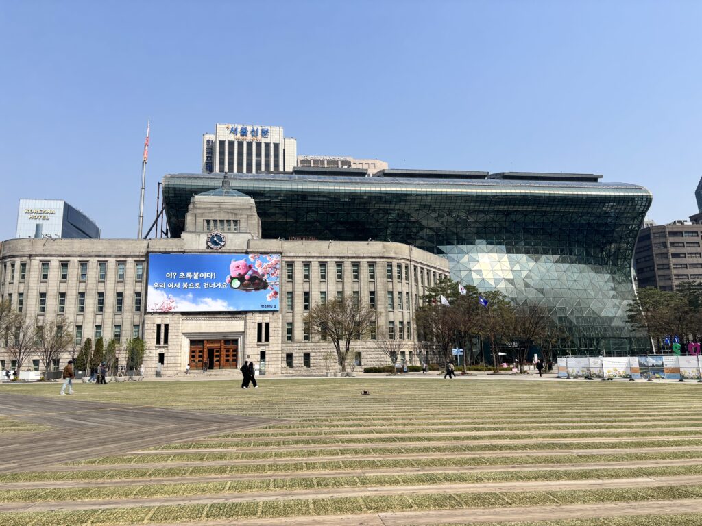 その後はSeoul City Hallへ。近代的なガラス張りの建物と旧市庁舎の組み合わせが印象的でした。