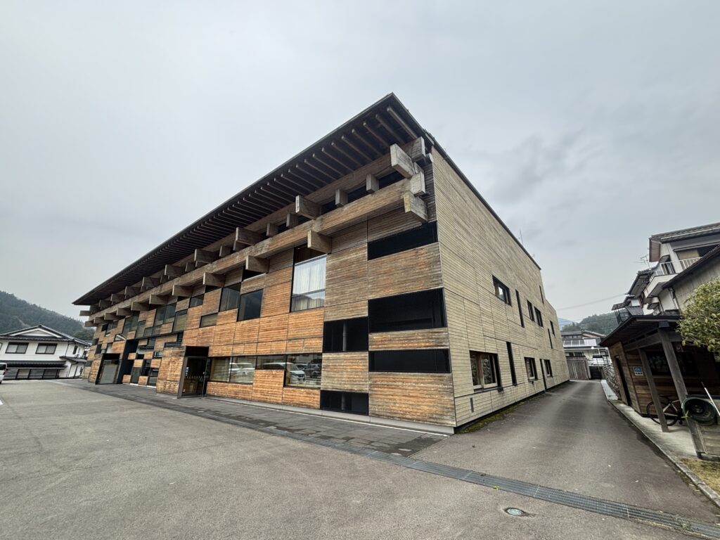 こちらも隈研吾設計の福祉施設。木のルーバーが特徴的な外観で、自然の中に溶け込むような優しい雰囲気がありました。