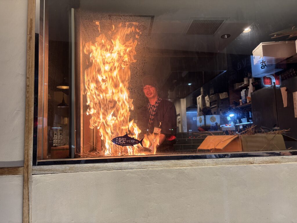目の前で豪快に藁を燃やしてカツオを焼き上げる様子は迫力満点。煙と炎が上がるたびに「わあ!」と声が上がります。3歳の子どもも炎を見て「あつい!すごい!」と大興奮でした。